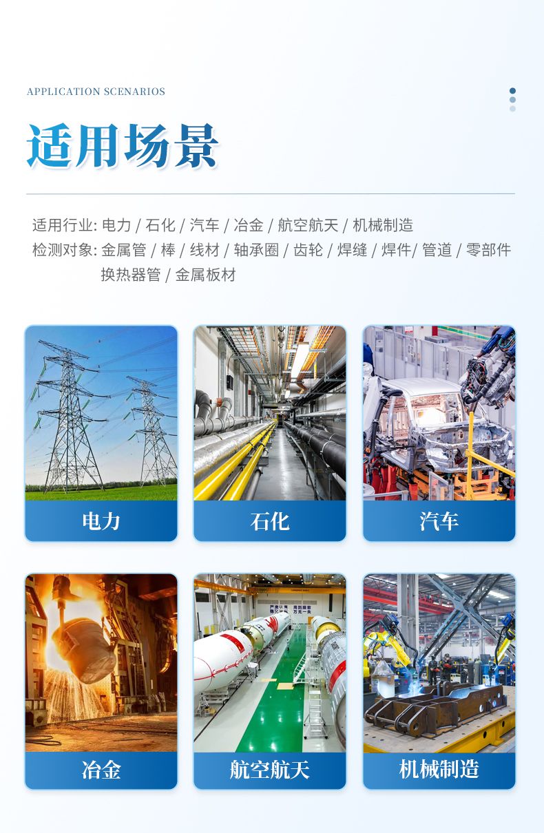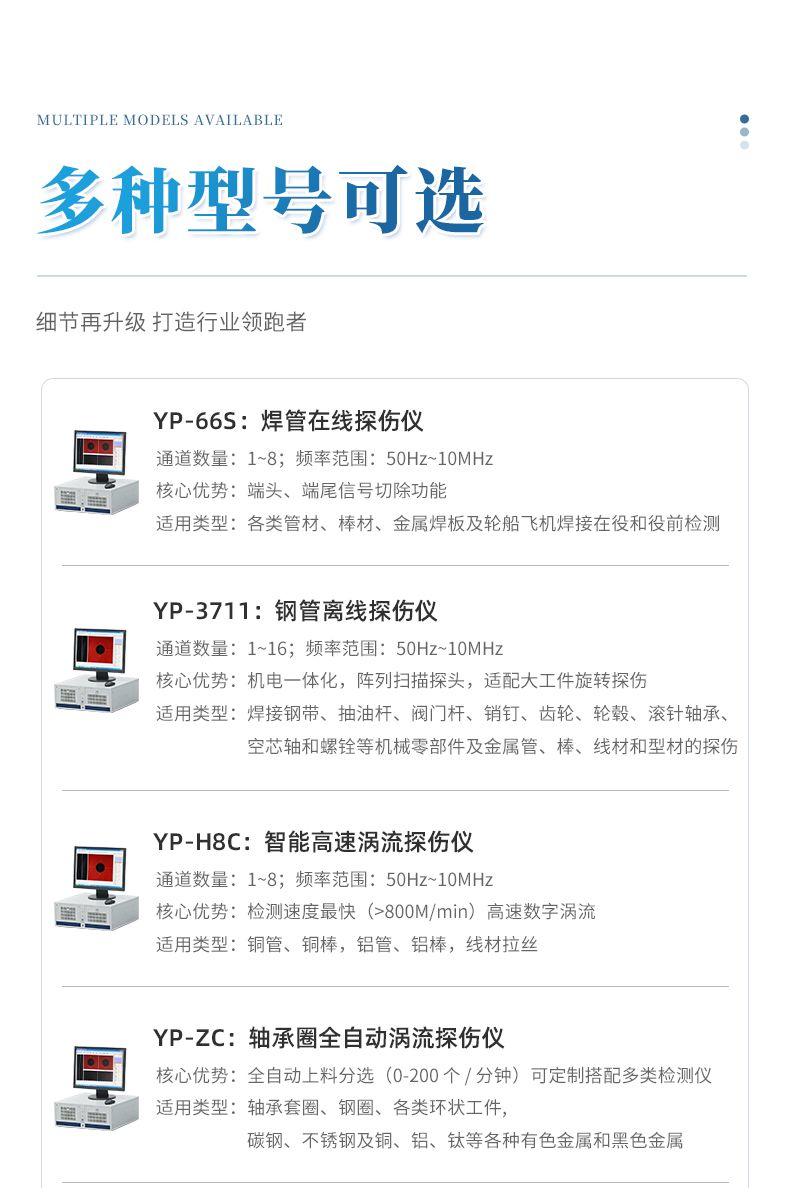 可配套渦流探傷儀、漏磁探傷儀、超聲探傷儀、磁記憶檢測儀、硬度儀等設(shè)備針對不同管徑不同要求搭配儀器。具體儀器參數(shù)詳見各儀器介紹。