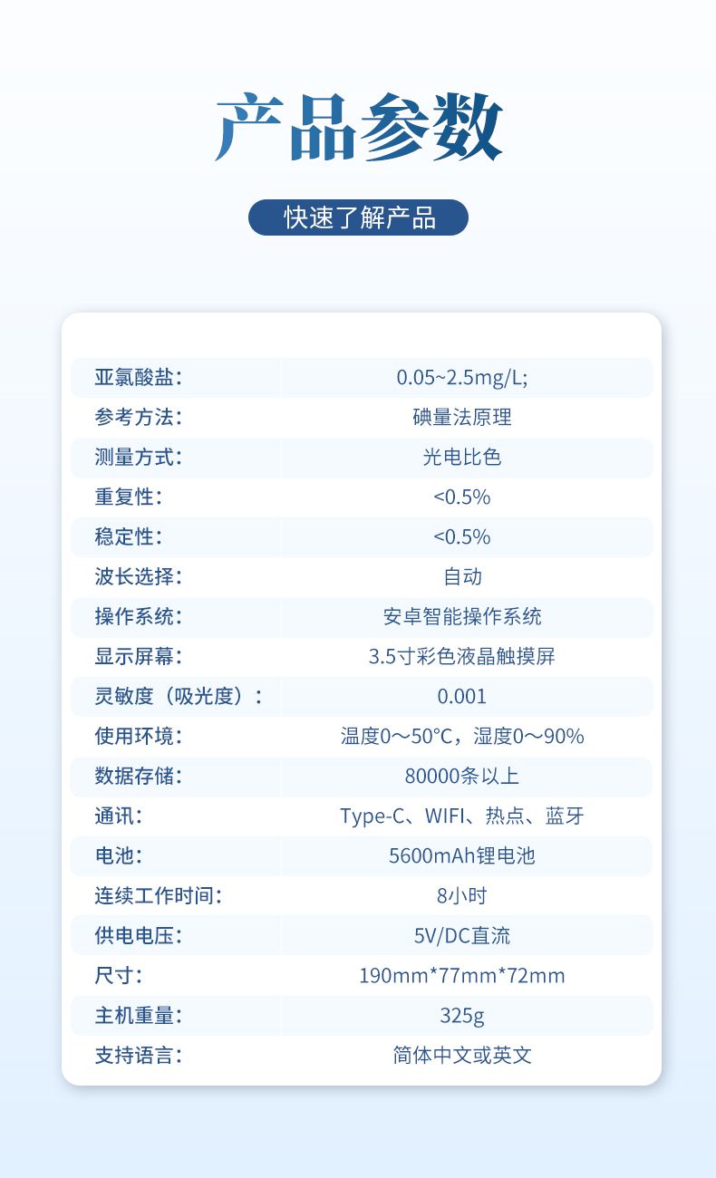 亞氯酸鹽是投放二氧化氯消毒劑后的副產物,超標對人有致癌作用。便攜式亞氯酸鹽檢測儀器配合快速顯色檢測試劑,可“快速、簡單、準確、穩定”進行測量,擁有精美的外觀造型,簡單的操作界面,準確的檢測系統,幫助用戶獲得精細的數據,可更準確、有效的分析水體狀況。