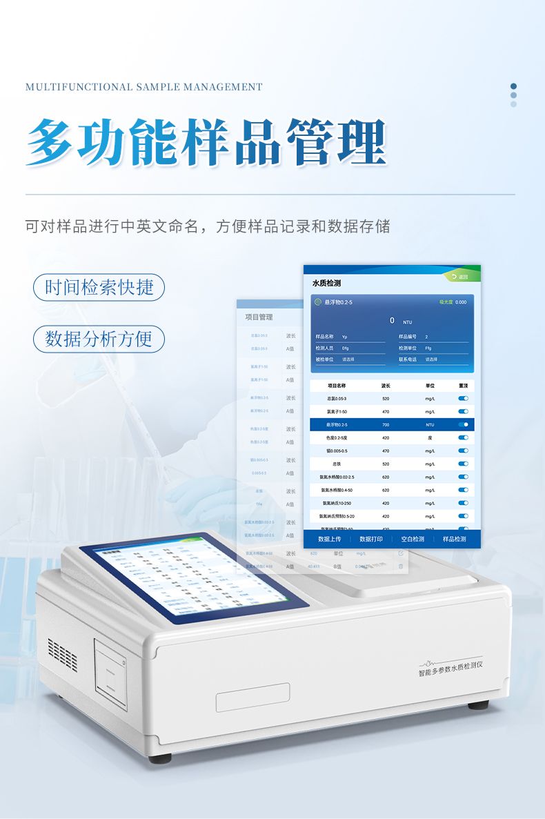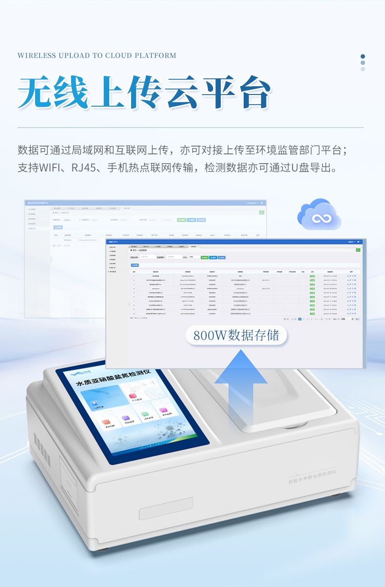 ②配置云監(jiān)控平臺(tái),檢測(cè)結(jié)果可直接無(wú)線傳至平臺(tái),進(jìn)行水質(zhì)長(zhǎng)短期分析,輔助管理。