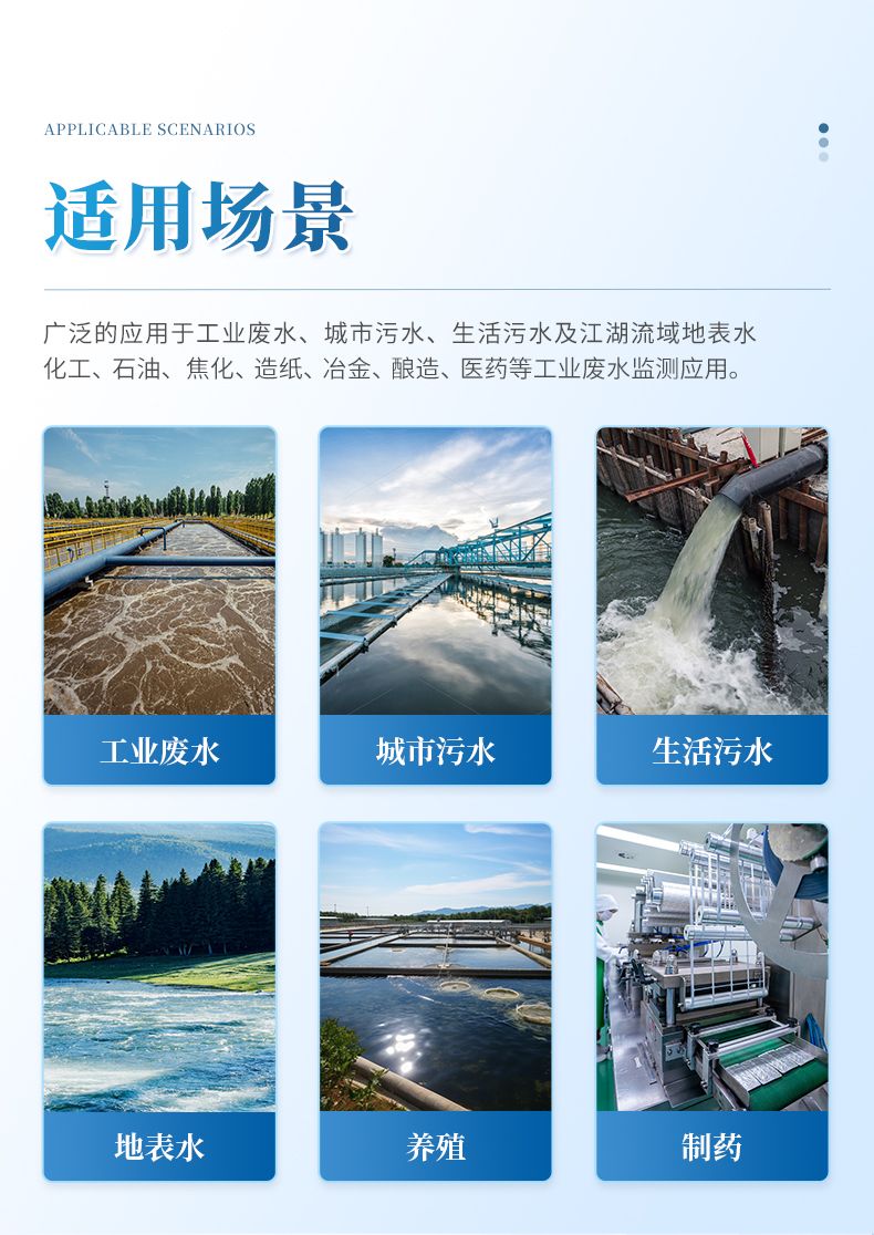 廣泛應(yīng)用于應(yīng)急監(jiān)測(cè)、工業(yè)廢水、生活污水、污水處理、醫(yī)藥化工、食品、飲品、紡織印染、電鍍、造紙、石油冶金、河流治理、科研單位、院校等領(lǐng)域。