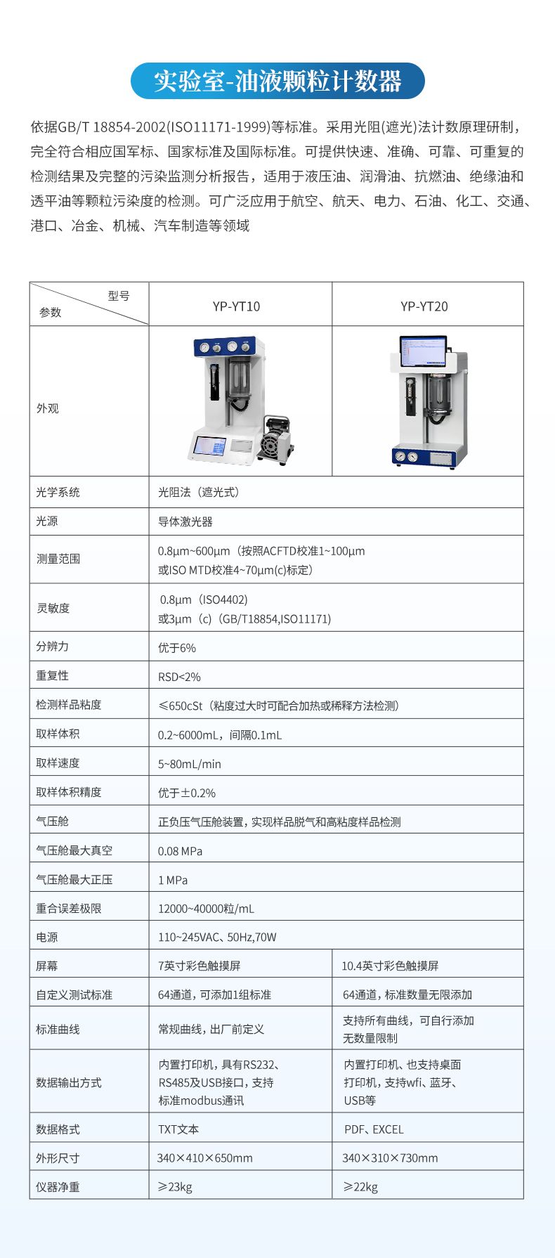 YZ20在線顆粒計數(shù)器是采用國際液壓標準委員會指定的光阻(遮光)法計數(shù)原理、依據(jù) GB/T 18854-2002(ISO11171-1999)等國家及國際標準研制的專門用于液體中污染粒子等級檢測的裝置。可提供快速、準確、可靠、可重復(fù)的檢測結(jié)果。操作簡單方便,適用于多種油液系統(tǒng)的在線監(jiān)測。也可將兩臺(或多臺)從機連接至同一主機或平臺進行比對試驗,操作簡單,組合靈活多變。可廣泛應(yīng)用于航空、航天、電力、石油、化工、交通、港口、冶金、水處理、機械、汽車制造等領(lǐng)域。