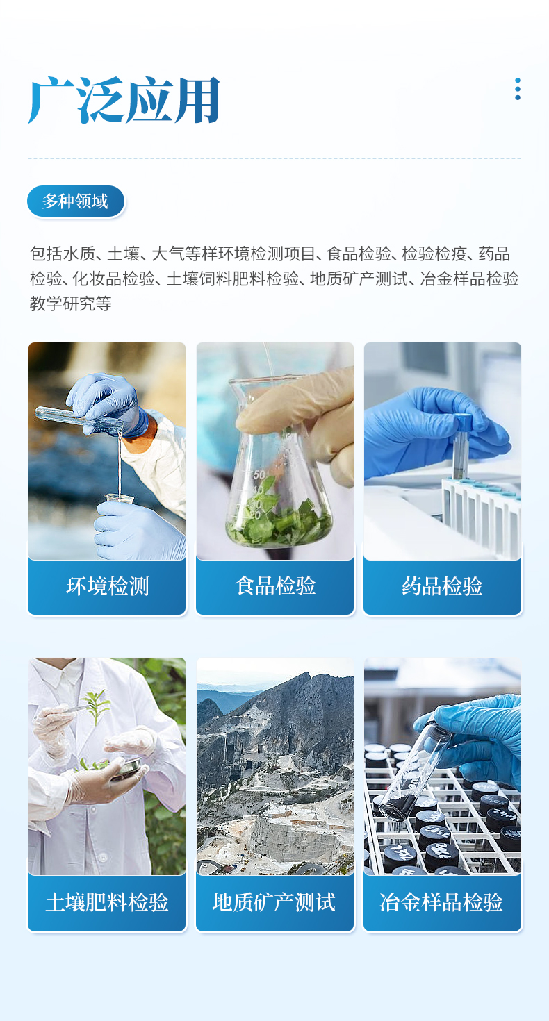 原子熒光光譜儀的應用領域較為廣泛,主要測試樣品中 11 種超痕量元素的含量,最低檢測下限可達千億分之一級。應用領域包括水質、土壤、大氣等樣環(huán)境檢測項目、食品檢驗、檢驗檢疫、藥品檢驗、化妝品檢驗、土壤飼料肥料檢驗、地質礦產測試、冶金樣品檢驗、教學研究等。