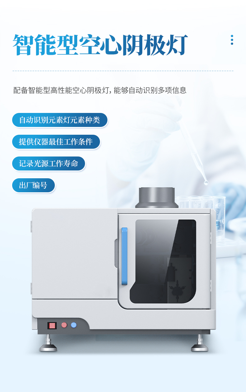 儀器配備智能型高性能空心陰極燈,儀器能夠自動識別元素燈元素種類、出廠編號、記錄光源工作壽命、提供儀器最佳工作條件等。
