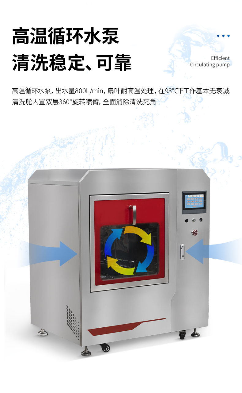 1.1全自動清洗設備,利用高溫、高壓水持續噴淋器皿內外表面,結合清洗液的作用,清潔器皿內外污物,進水、清洗、排水、烘干全自動完成,無需人工干預;