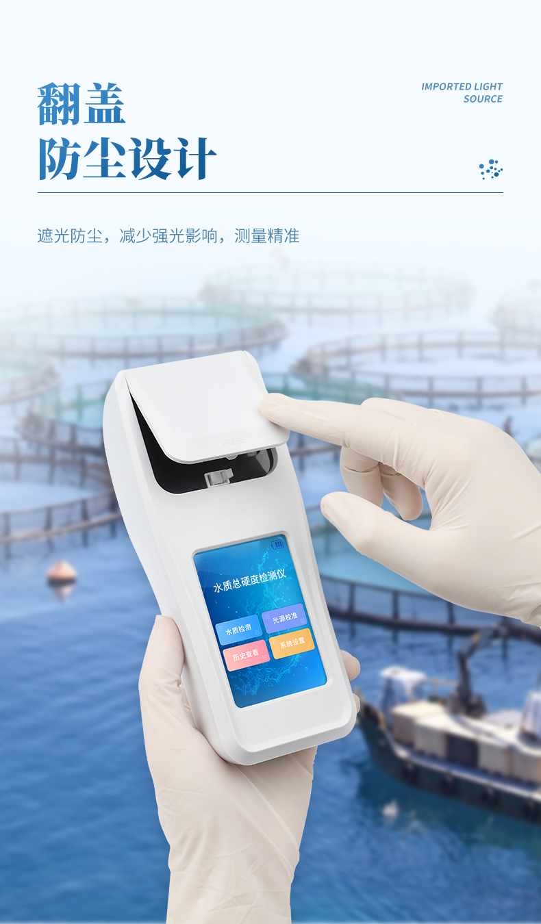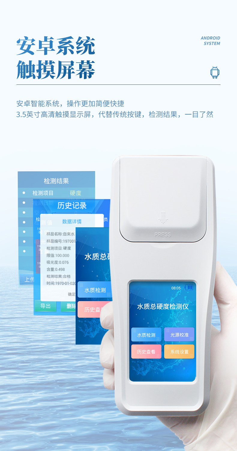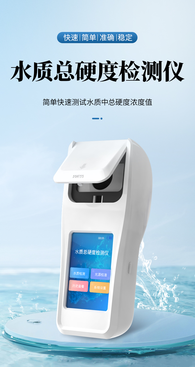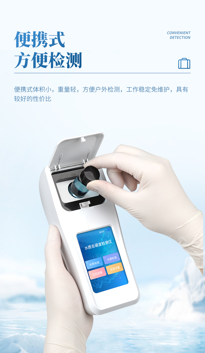 水質(zhì)總硬度檢測儀可簡單快速測試水質(zhì)中總硬度濃度值。利用比色法原理配合總硬度檢測試劑快速準(zhǔn)確測試水中總硬度含量。