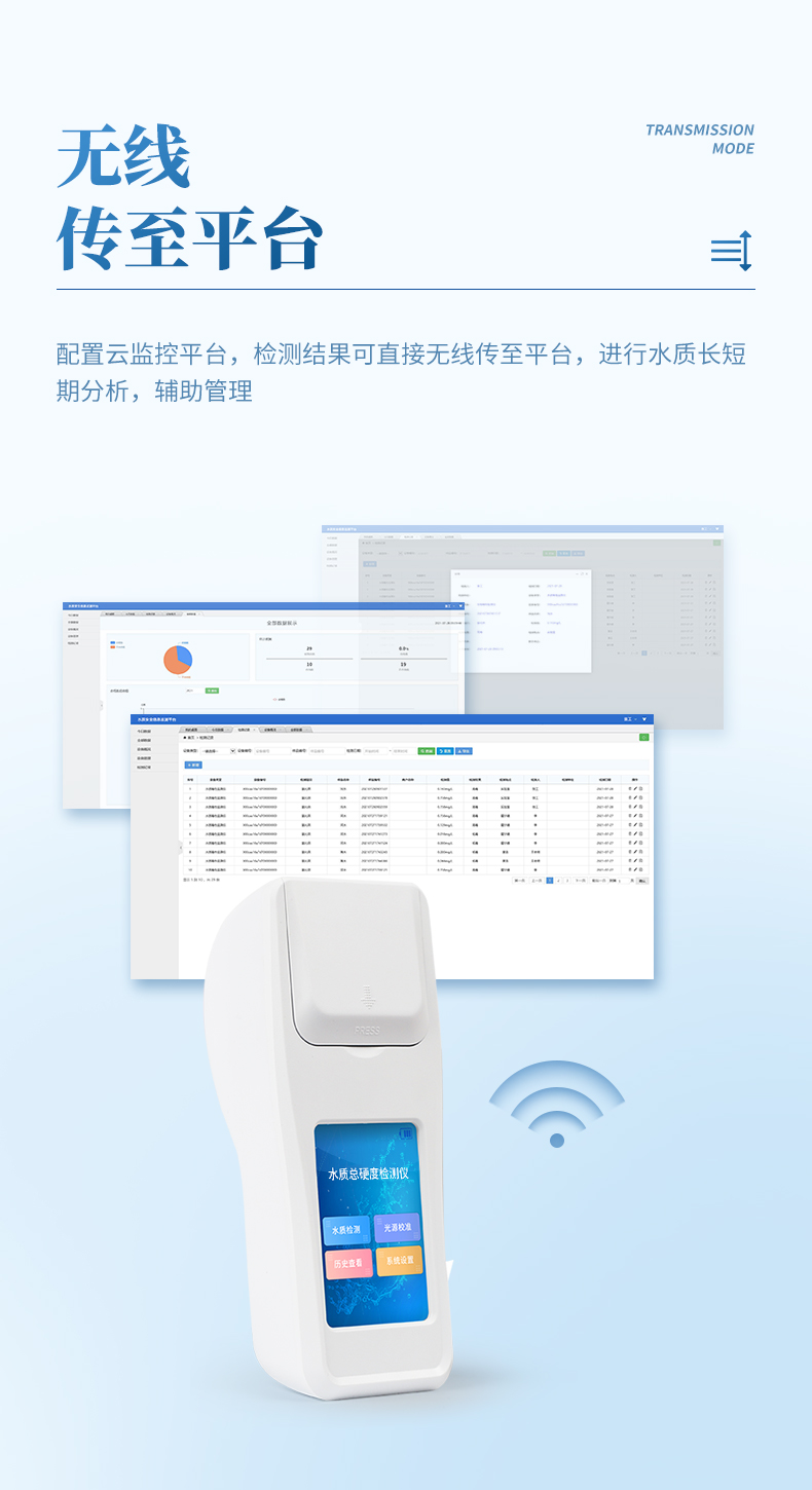 ②配置云監(jiān)控平臺,檢測結(jié)果可直接無線傳至平臺,進(jìn)行水質(zhì)長短期分析,輔助管理。