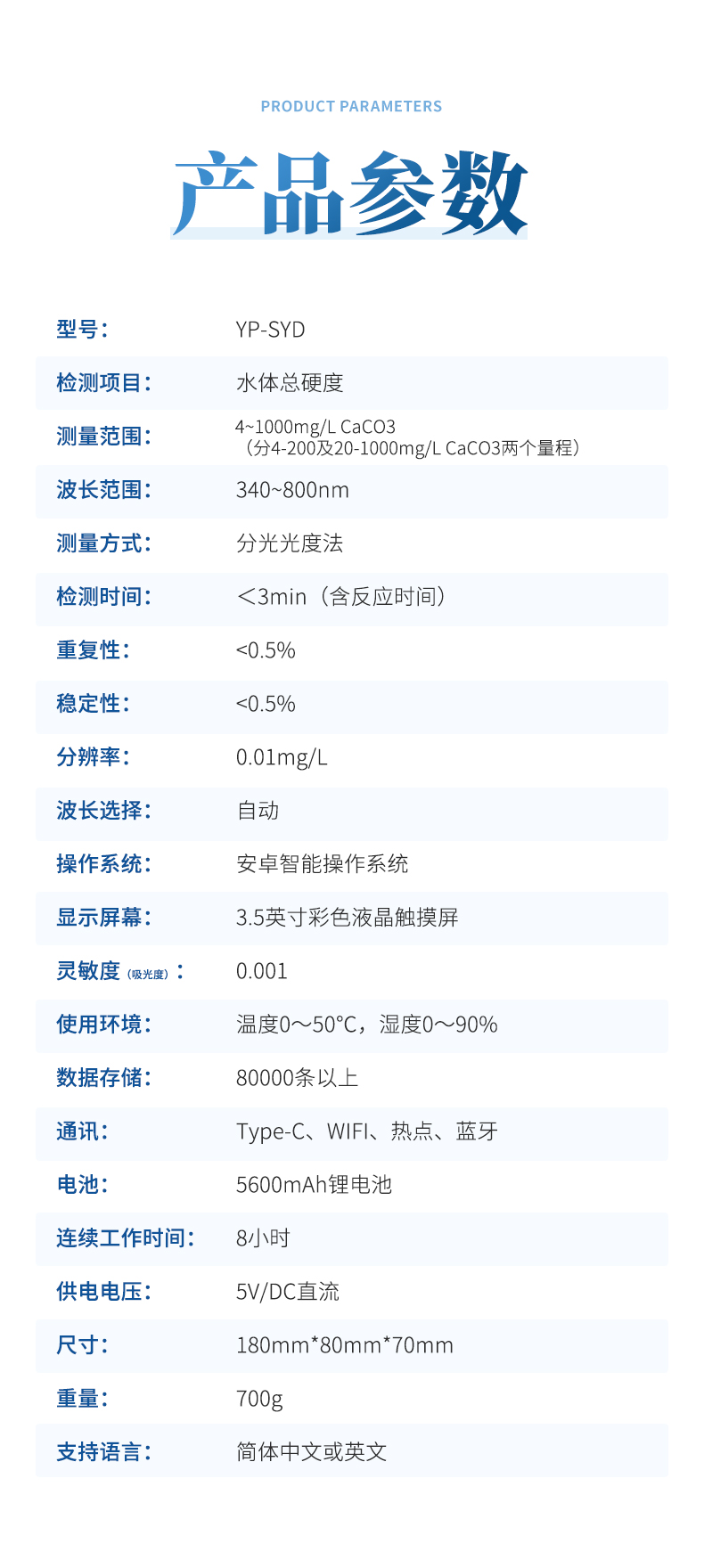 測量范圍:4~200mg/L,20~1000mg/L(以CaCO3計);